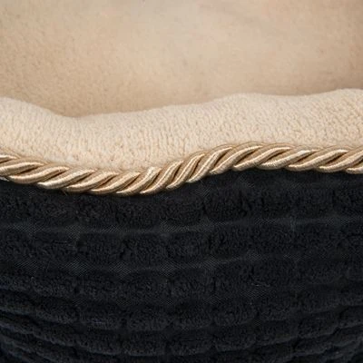 El color negro de la tela exterior contrasta con la tela suave y cómoda del interior de color beige y con el cordón dorado; el resultado es una cama de lo más elegante. El cojín de dos colores es extraíble y se puede lavar aparte de la cama.