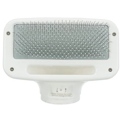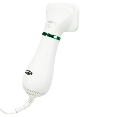 El cepillo de aire caliente Trixie funciona como un secador de pelo. Tiene dos niveles de calor y funciona con un motor suave y poco ruidoso. Tiene cerdas y protuberancias de plástico para un tacto cómodo en la piel y el pelo de tu perro.