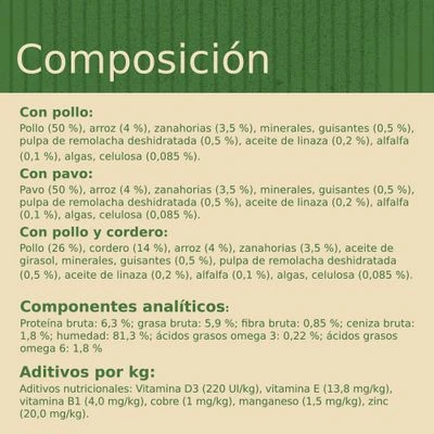 - Ingredientes naturales: con carne de pollo, pavo o cordero y con arroz y verduras seleccionadas