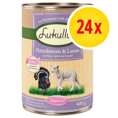 Cada pack ahorro de Lukullus Junior contiene 24 latas de 400 g cada una a un precio muy económico. Los packs disponibles son: