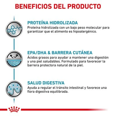 Royal Canin Veterinary Canine Hypoallergenic es un alimento dietético completo para perros con alergias o intolerancias alimentarias. Proporciona proteínas hidrolizadas con potencial alergénico bajo. Además, puede favorecer la barrera cutánea natural. Contiene ácidos grasos omega 3 EPA y DHA.