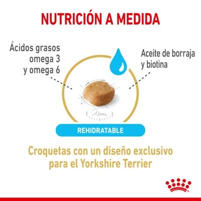 Pienso completo para yorkshire terrier a partir de 8 años, creado para favorecer la salud en la etapa senior. Con complejo para la barrera de la piel para un pelo bonito. Croquetas con forma adaptada.